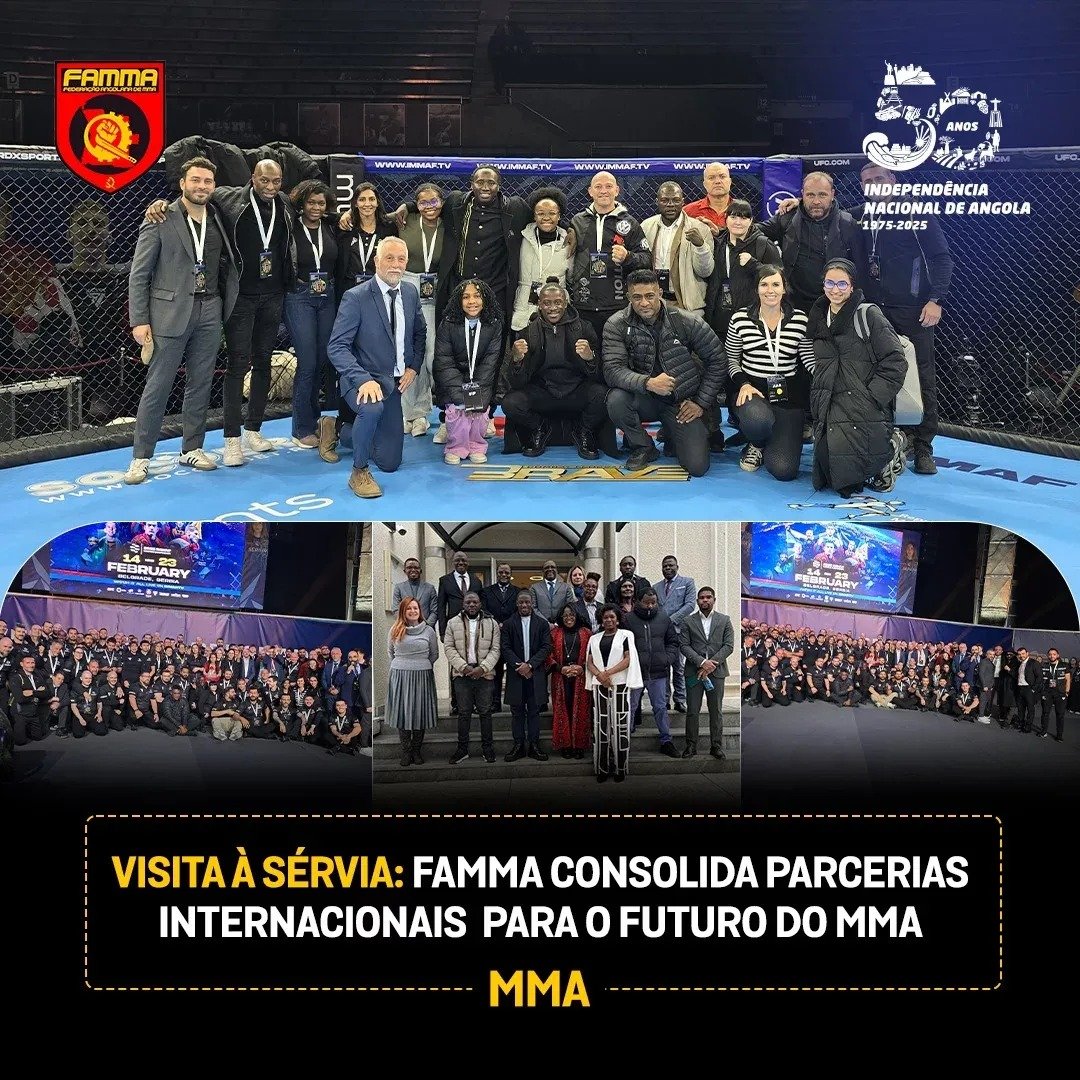 DIA NACIONAL DO DESPORTO PRONTOS PARA DOMINAR O CONTINENTE! VISITA À SÉRVIA: FAMMA CONSOLIDA PARCERIAS INTERNACIONAIS PARA O FUTURO DO MMA Programa Crime Zero Shihan Andrey Moshanov, visitou recentemente a província do Uíge MANEL KAPE NA LUTA PRINCIPAL DO UFC EM LAS VEGAS: ANGOLA RUMO À VITÓRIA! ATLETAS DA SELECÇÃO NACIONAL PARTICIPAM EM PALESTRA SOBRE NUTRIÇÃO FAMMA E CANAL ZAP VIVA ASSINAM ACORDO DE TRANSMISSÃO EXCLUSIVA DO CAMPEONATO AFRICANO DE MMA ANGOLA ESTÁ PRONTA PARA ACOLHER O CAMPEONATO DO MUNDO DE 2026, DIZ DIRECTOR DA IMMAF ZAP E FAMMA REALIZAM VISITA TÉCNICA AO PAVILHÃO MULTIUSOS DO KILAMBA AGRADECIMENTO À TELEVISÃO PÚBLICA DE ANGOLA (TPA) FAMMA CONSOLIDA PARCERIAS INTERNACIONAIS PARA O FUTURO DO MMA PRESIDENTE DA FAMMA EM BELGRADO PARA REUNIÃO COM A IMMAF